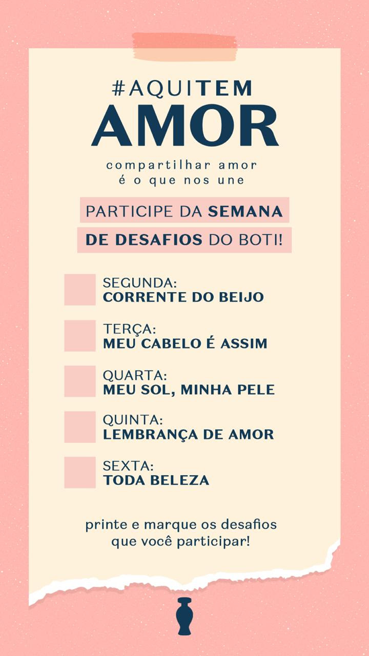 Esse e outros desafios de beleza serão tema do movimento #AquiTemAmor, que a marca colocou no ar no Instagram e no Facebook para provocar reações positivas e aliviar a rotina do #ficaemcasa durante o período de quarentena. “O contágio aqui vai ser de amor, de cuidado e carinho. É isso que nos conecta nesse momento. ”, explica Gustavo Fruges, diretor de comunicação do Boticário.