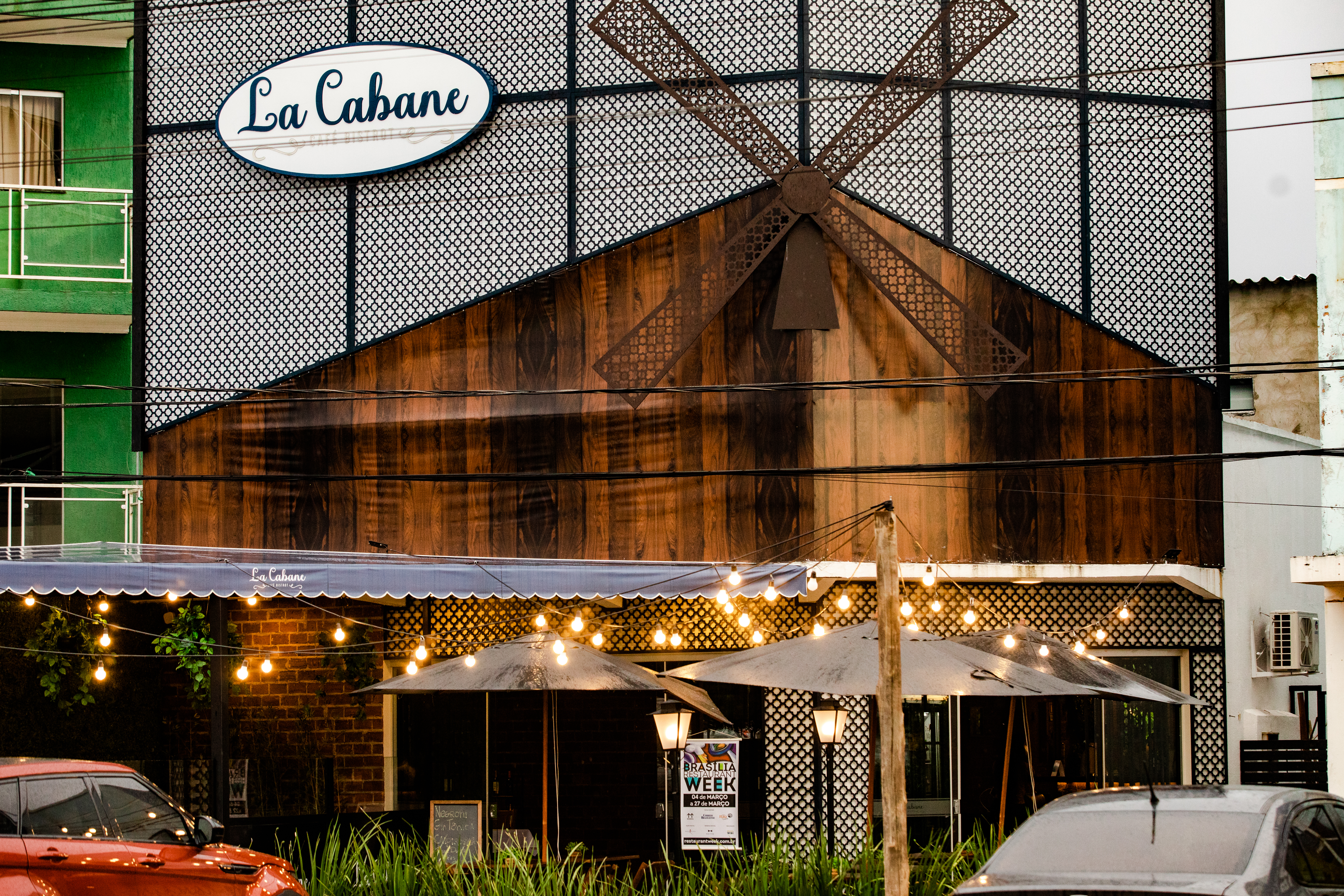Localizado no polo de artesanato do Jardim Botânico, o La Cabane conta com quatro ambientes: hall, salão, mezanino e varanda, onde os dois últimos dispõem de uma vista privilegiada para a área de preservação ambiental que dá nome a cidade, proporcionando uma experiência única entre o almoço e o jantar com vistas para as grandes árvores, folhas verdes, plantas e flores da região.