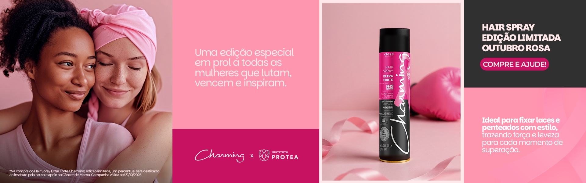 A Charming, marca da Cless Cosméticos, se une ao movimento Outubro Rosa com uma ação especial com o seu tradicional Hair Spray Extra Forte. Durante todo o mês de outubro, parte das vendas do produto será revertida para o Instituto Protea, organização que custeia exames, cirurgias e tratamentos contra o câncer de mama para mulheres de baixa renda em todo o Brasil. Normalmente encontrado em embalagem totalmente preta, o produto ganha, durante a campanha, uma faixa rosa impressa no frasco, em alusão à causa.