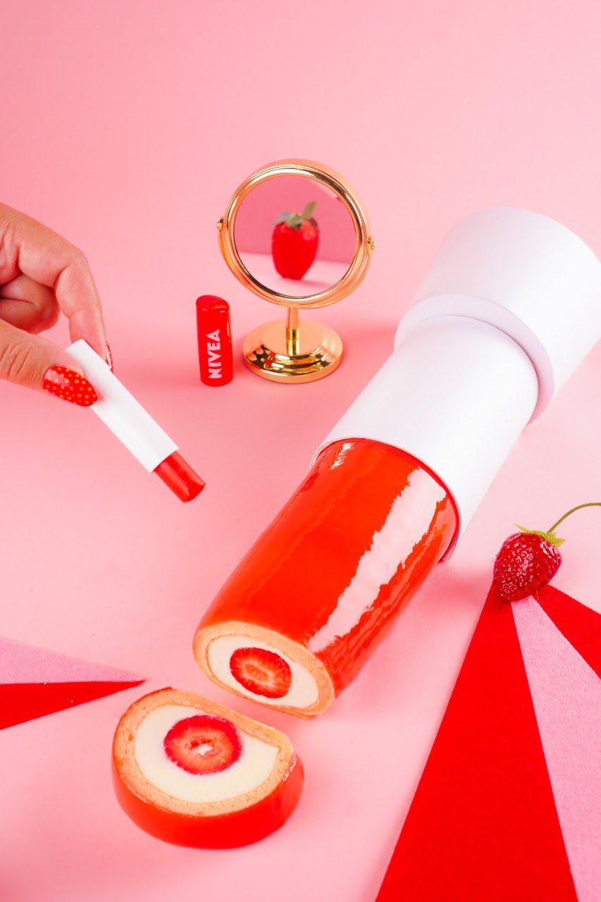 Os hidratantes labiais NIVEA, em suas versões Fruity Shine, deixam um cheirinho especial de fruta nos lábios. Há quem diga que até dá vontade de comer! Para explorar essa sensação e aguçar ainda mais o paladar de todos os apaixonados pelos produtos da marca, principalmente o NIVEA Morango Shine, a confeiteira e diretora criativa Raíza Costa criou uma sobremesa em formato de hidratante labial para a nova campanha Hidrate sua boca de novas Sensações.
