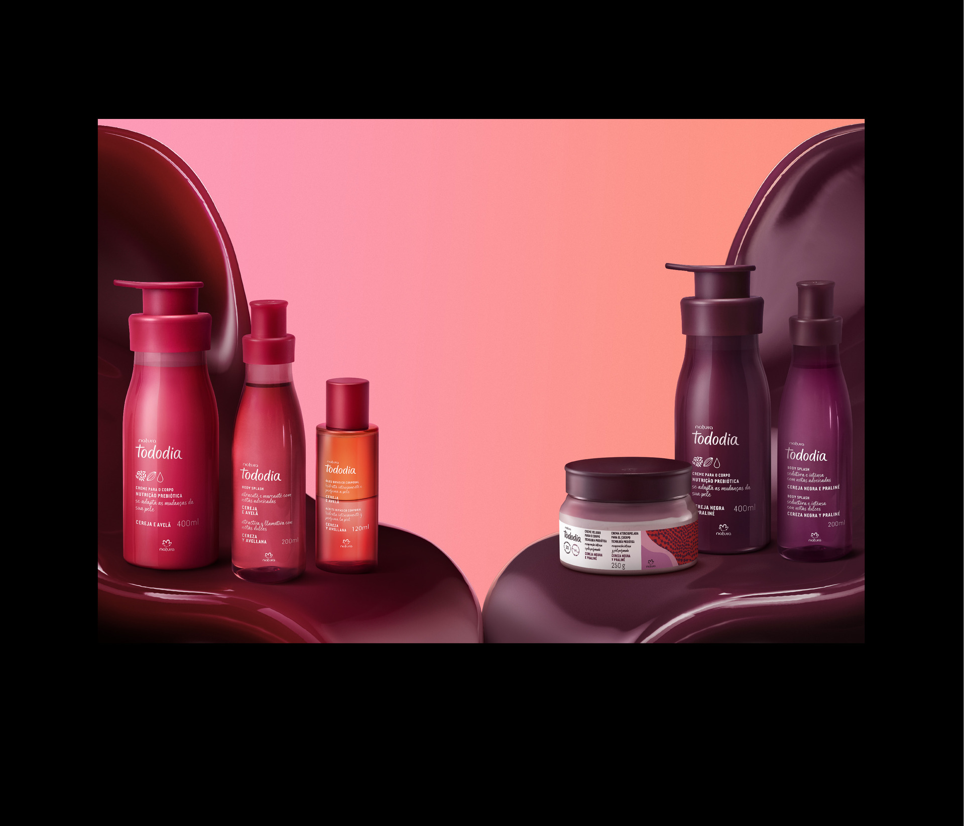 Com texturas deliciosamente envolventes, tanto Tododia Cereja Negra e Praliné quanto Tododia Cereja e Avelã oferecem uma experiência intensa de hidratação perfumada, com produtos para uma rotina completa de cuidados, que vão desde o banho até a hidratação dos lábios e do corpo, para uma pele ultra macia, perfumada e aveludada ao toque. “Cereja Negra e Praliné chega para complementar a icônica fragrância de Cereja e Avelã. Como especialistas no universo da cereja, ampliamos nosso portfólio ao lançar uma nova versão e resgatar um clássico, oferecendo um cuidado diário completo para a mulher — com itens para a pele, cabelos, lábios e higiene íntima”, afirma Tatiana Ponce, vice-presidente de marketing, líder de pesquisa e desenvolvimento da Natura.