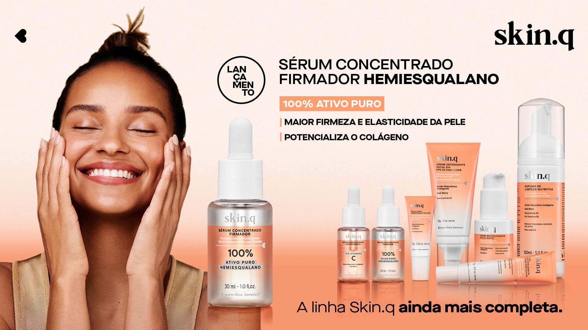 Skin.q é uma linha de cuidados faciais feita especialmente para descomplicar a rotina diária de cuidados com a pele. 100% vegana e não testada em animais – assim como todo o restante do portfólio da marca. A linha é composta por produtos curingas, para você compor sua rotina ideal de cuidado: Espuma de Limpeza Nutritiva,Sérum Concentrado Antioxidante Vitamina C, Gel Revitalizador para Área Dos Olhos , Creme Antioxidante Dia, Creme Revitalizador Noite, Balm Labial de Hidratação e Volume e Gel Revitalizador para Área Dos Olhos. Os produtos da linha possuem ativos de alta tecnologia como Ácido Hialurônico Inteligente e a superfruta Goji Berry.