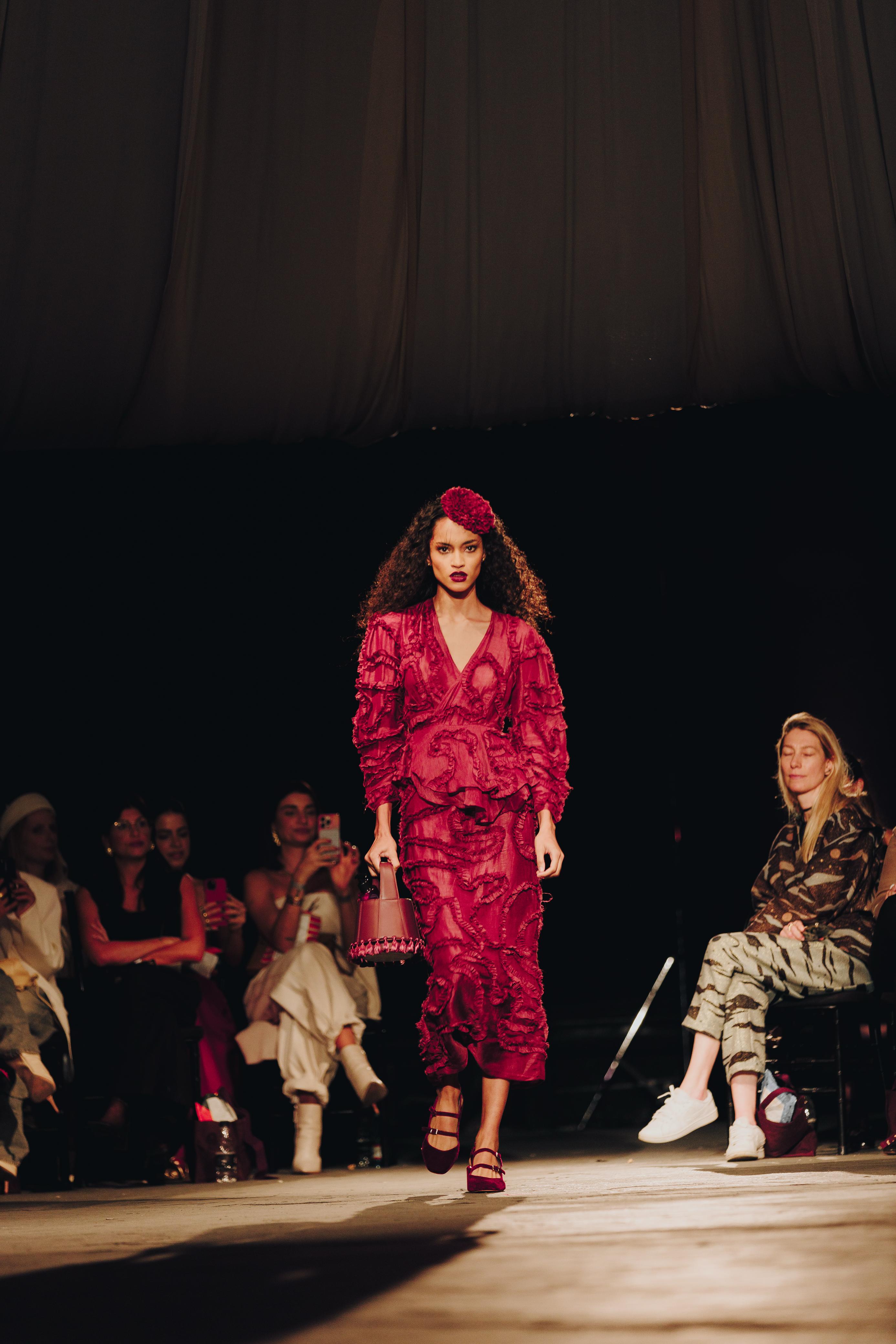 “Para criar um olhar impactante, usei a Máscara de Cílios Ultra Resistente Turbo Soul de Eudora, que entrega muito volume e definição. Apliquei várias camadas para alcançar esse efeito super dramático. Na pele, usei base e corretivo da linha Skin Perfection, que tem alta cobertura e longa duração, e selei tudo com o pó solto Niina Secrets Perfect Match. Já nos lábios, o batom líquido Vinho Sublime Glam Matte Tint trouxe o toque final de elegância, com uma cor intensa, acabamento impecável e sem transferência”, explica Mika Safro, responsável pela beleza do desfile.